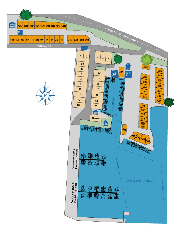 Our RV community offers coveted waterfront sites, allowing residents to wake up to stunning views and the soothing sounds of the trains on the Portage River. These premium locations provide an exceptional living experience amidst nature’s tranquility.