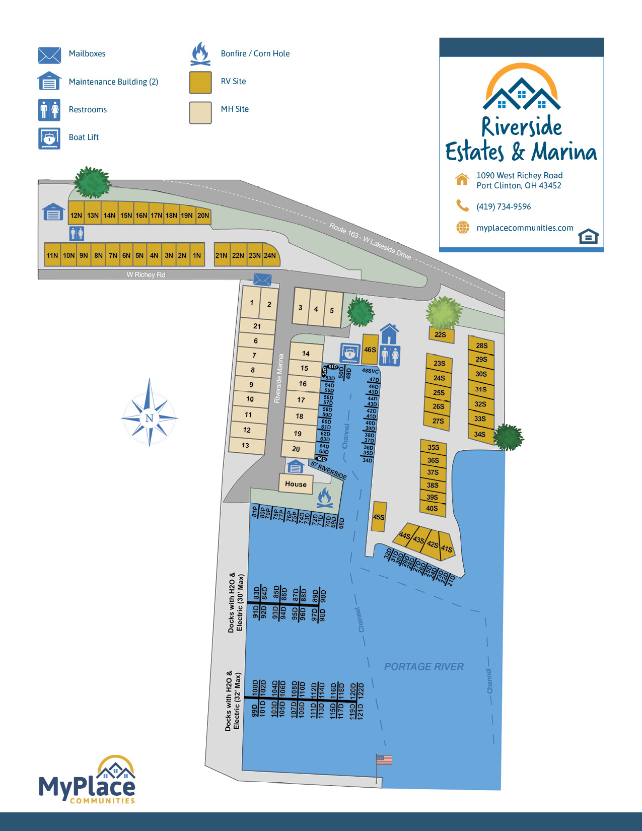MyPlace at Riverside Estates & Marina offers a serene escape with 21 meticulously maintained sites exclusively for residents aged 55 and up. Experience year-round comfort in a picturesque waterfront setting that boasts breathtaking views of the Portage River. Our seasonal RV community features 46 spacious sites, including coveted waterfront options, providing flexibility and convenience for families and individuals seeking seasonal weekend “getaways” from May 1st to October 31st.